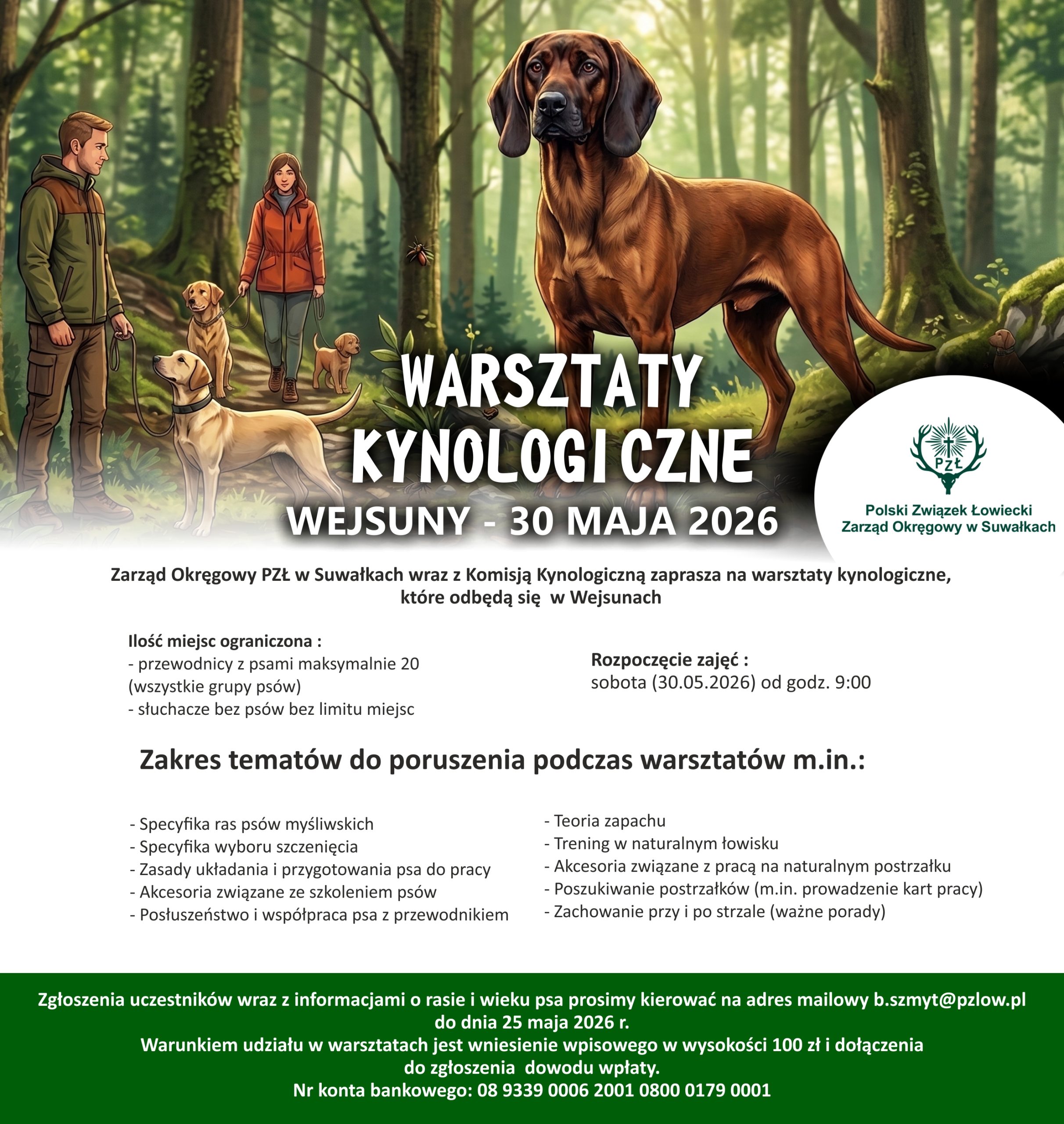 Zgłoszenia uczestników wraz z informacjami o rasie i wieku psa prosimy kierować na adres mailowy b.szmyt@pzlow.pl do dnia 25 maja 2026 r. Warunkiem udziału w warsztatach jest wniesienie wpisowego w wysokości 100 zł i dołączenia do zgłoszenia  dowodu wpłaty.